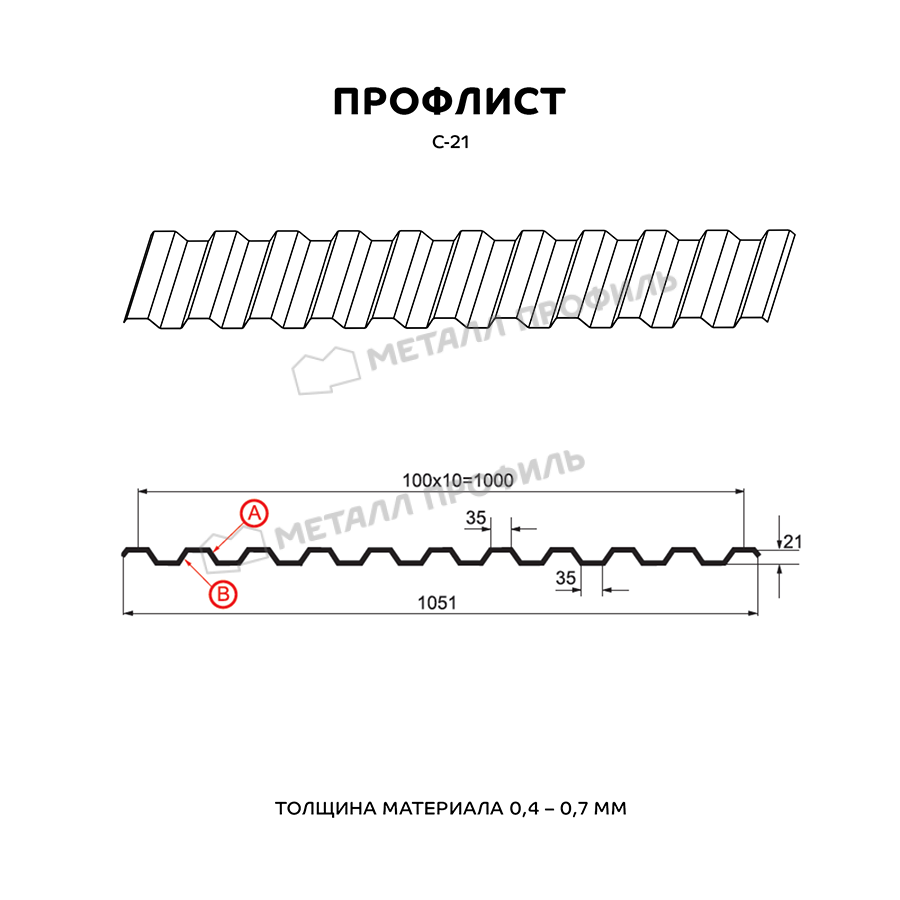 Профнастил с пометкой С-21 следует понимать, как «стеновой» тип с глубиной профиля 21 мм. Тем не менее, С-21 – один из наиболее универсальных стройматериалов, применяемый не только для фасадов. Он подойдёт как для обшивки стен, так и для монтажа кровельного покрытия, возведения ограждений. С успехом С-21 находит применение в строительстве складских помещений, быстровозводимых зданий, торговых павильонов, а также в качестве элемента сэндвич-панелей. С-21 отлично подходит в качестве стройматериала для Профилированного листа. Для этого он обладает хорошей несущей способностью. Довольно близко расположенные трапециевидные волны обеспечивают ему достаточную жёсткость. А пропорциональный рельеф профиля, идентичный с обеих сторон, придаёт Профилированному листу гармоничный облик. По вашему заказу мы изготовим профнастил С-21 в различной толщине стали от 0,4 до 0,7 мм. Для повышения срока службы и внешней привлекательности, профилированный лист изготавливается с финишным покрытием различных цветов и текстур, включая покрытия под камень, дерево, кирпич.
